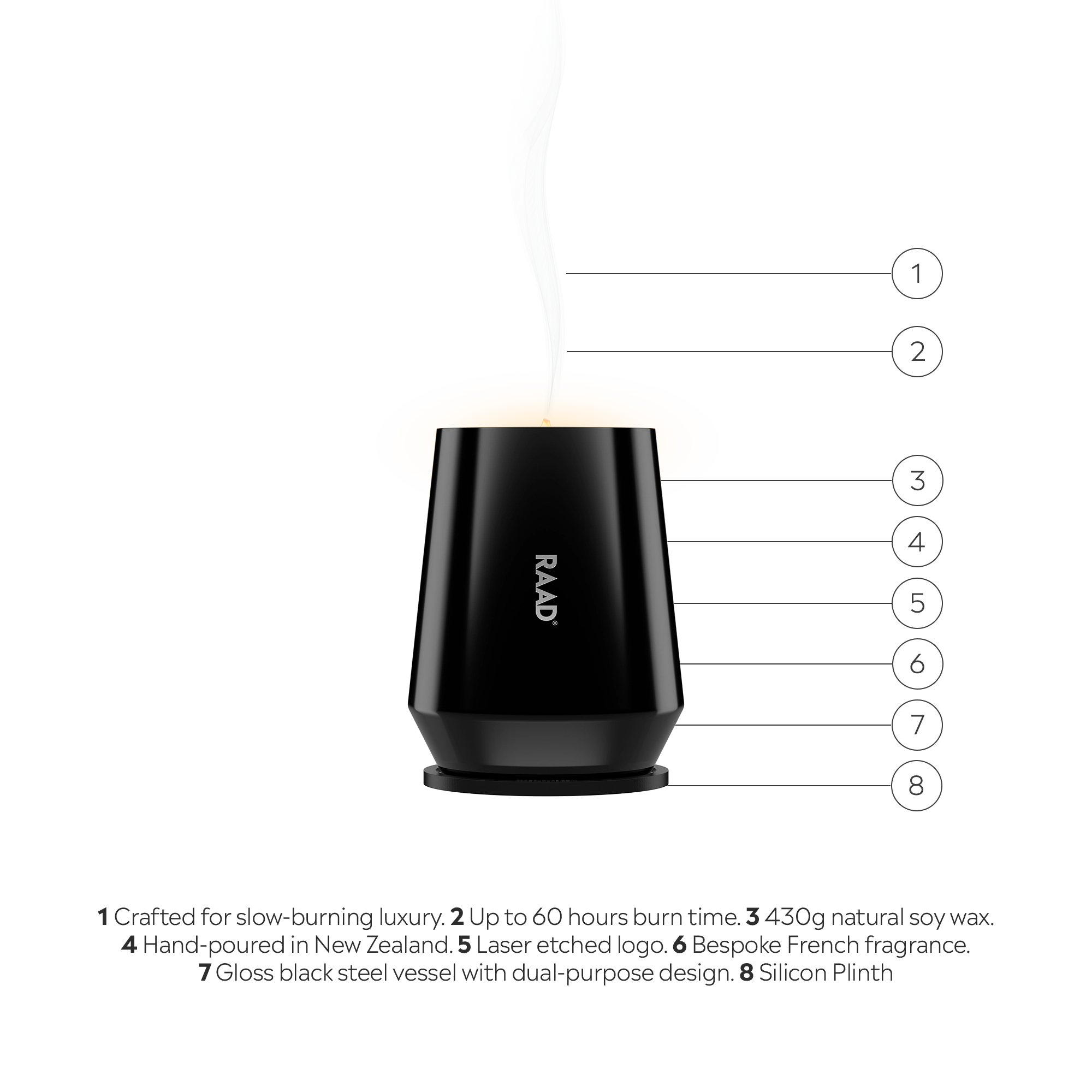 Housed in a distinct, gloss-black stainless steel vase with its own resting plinth and snuff-lid, this hand-poured candle is a sculptural statement of light & scent. Drenched in sensuous Pepper & Silk, a bespoke RAAD® fragrance crafted in Grasse, France, designed to stimulate your senses and nurture positive emotions & memory connections.